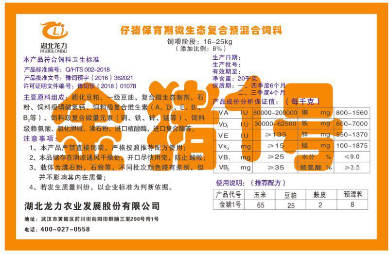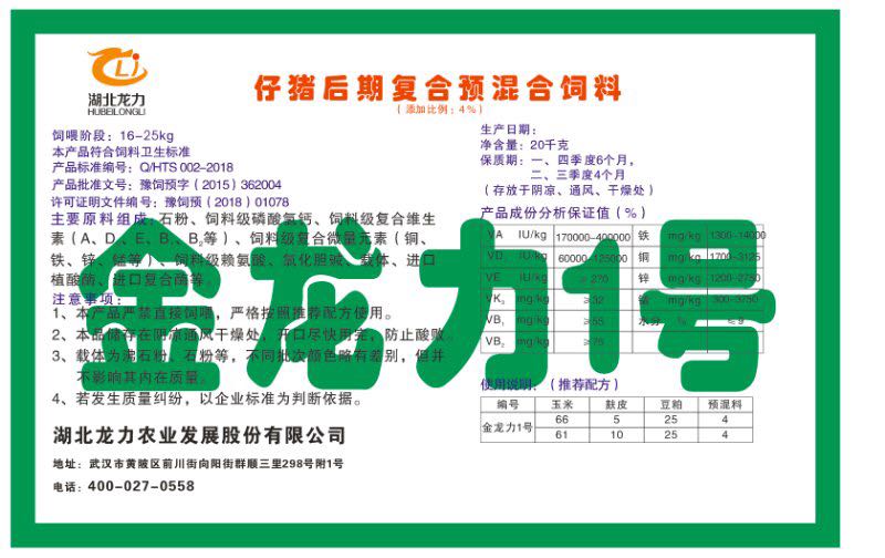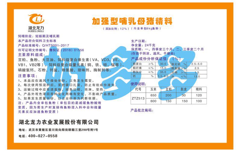 湖北龍力農(nóng)業(yè)發(fā)展股份有限公司坐落于武漢市黃陂區(qū)前川街向陽街群順三里298號(hào)附1號(hào)。公司成立于2014年6月,公司自成立以來把“創(chuàng)全球最大養(yǎng)豬綜合服務(wù)”為企業(yè)愿景。致力于打造教保料品牌”作為公司發(fā)展的明確目標(biāo)。公司一直致力于豬營養(yǎng)的研究和開發(fā),積極與國內(nèi)外高校和科研機(jī)構(gòu)合作,推廣養(yǎng)豬技術(shù)、動(dòng)物營養(yǎng)新概念,向世界農(nóng)牧企業(yè)學(xué)習(xí)與合作。公司采用國內(nèi)先進(jìn)的生產(chǎn)工藝,選擇高精度電子配料秤,高均勻度、無殘留混合機(jī)等先進(jìn)設(shè)備....
